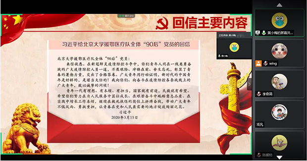 黄小梅同志首先进行分享,首先介绍了2020年3月15日习近平给北京大学援鄂医疗队全体“90后”党员的回信,信中写到“青年一代有理想、有本领、有担当,国家就有前途,民族就有希望。希望你们努力在为人民服务中茁壮成长、在艰苦奋斗中砥砺意志品质、在实践中增长工作本领,继续在救死扶伤的岗位上拼搏奋战,带动广大青年不惧风雨、勇挑重担,让青春在党和人民最需要的地方绽放绚丽之花。”接着黄小梅同志播放了相关新闻,分享了护士郑琼、武汉00后志愿者余同学、武汉常青花园社区志愿者和温瑞同志等人的事迹,其中重点讲述了河南省南阳市镇平县高丘镇黑虎庙小学校长张玉滚的事迹。这些优秀的青年人代表不仅“有理想、有本领、有担当”,更是在践行着“让青春在党和人民最需要的地方绽放绚丽之花”,他们都是我们学习的榜样。