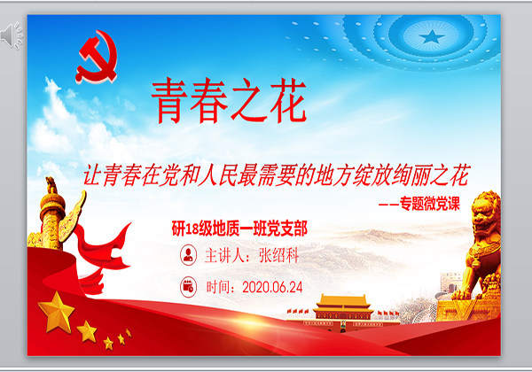 2020624日,研18级地质一班党支部开展云上微党课,主题为“让青春在党和人民需要的地方绽放绚丽之花”,主讲人为支部书记张绍科同志。