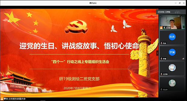 研2019级测绘2班党支部开展“四个一”系列活动之专题组织生活会,主题为:迎党的生日,讲抗疫故事,悟初心使命。旨在分享宣传弘扬抗疫一线基层党组织和广大党员干部担当使命、勇毅逆行的先进事迹和精神风貌,鼓舞党员对标先进典型,争做模范党员。此次生活会利用腾讯会议平台开展,活动由党支部书记王所智同志主持,除一名党员和一名积极分子请假,其余同志悉数参会。