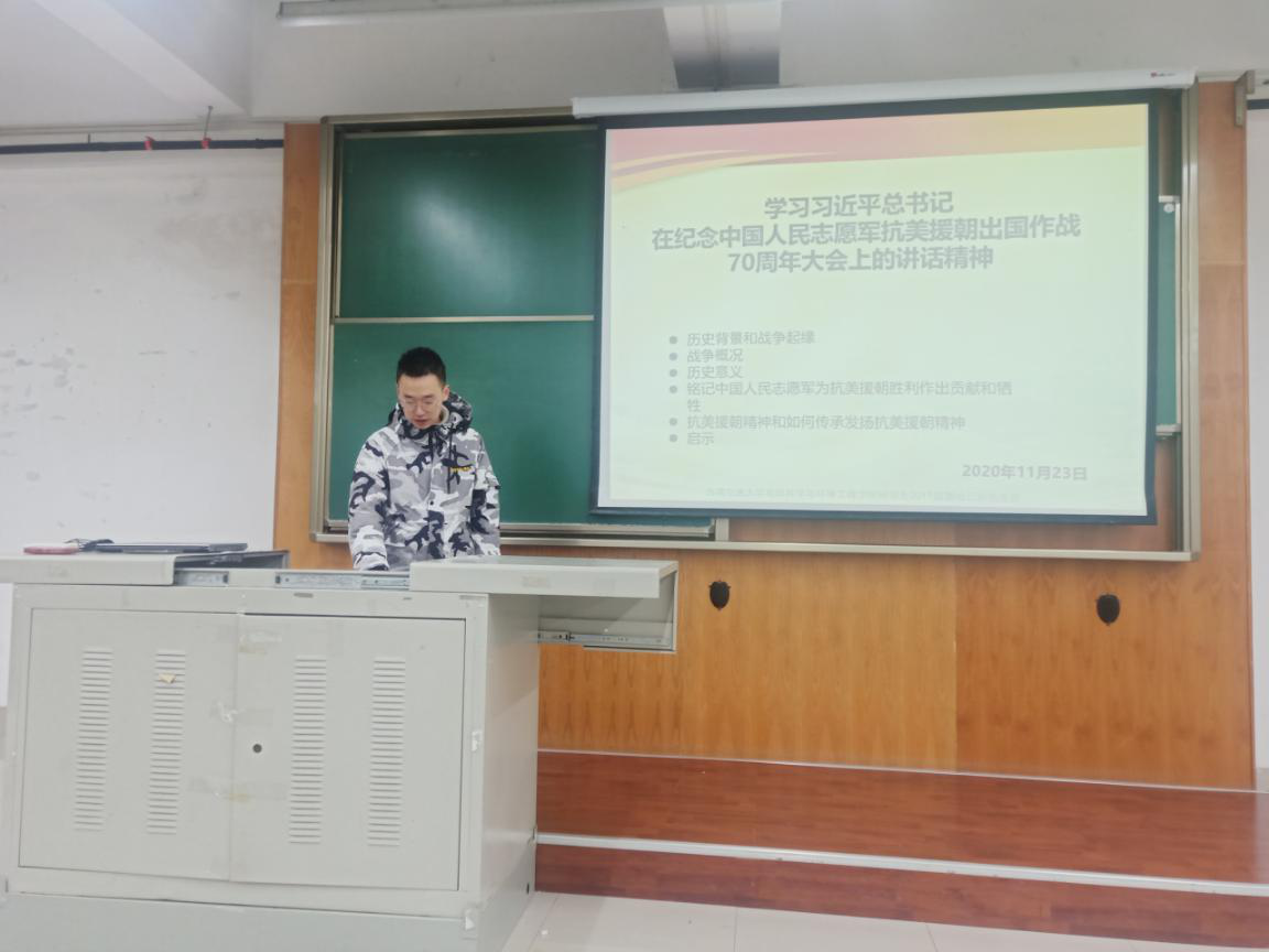 11月23日晚七点半,研19级测绘三班党支部在X4350教室开展了“继承和发扬抗美援朝精神”主题党日活动及“知党史、跟党走”党史读书会活动。活动第一部分,支部书记刘明仁带领大家学习了习近平总书记在纪念抗美援朝出国作战70周年大会上的讲话。活动第二部分,大家分享了阅读党史相关读物的笔记和感想。活动由支部书记刘明仁主持,支部在校党员和积极分子参加。