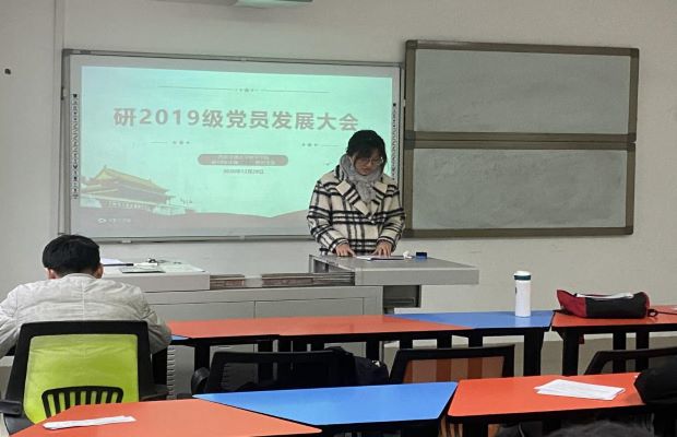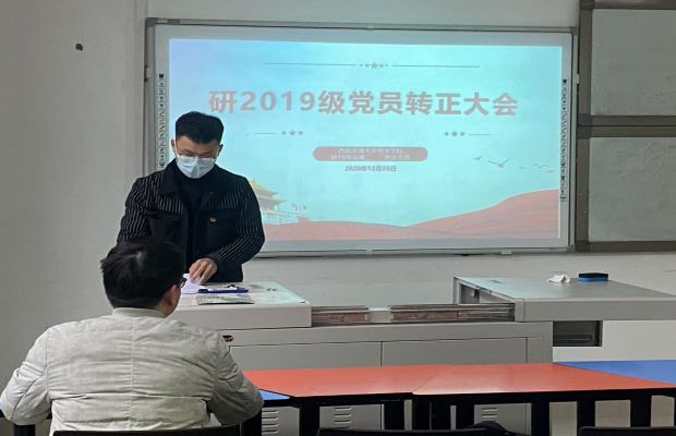 2020年12月28日下午4:00,研19级环境二班党支部在X4132教室召开支部党员大会,讨论关于接受罗景城同志按期转为中共正式党员以及关于接受李欢、董贵明、郑鑫、李红菲同志为预备党员的相关事项。支部共有正式党员4名,预备党员1名,到会正式党员4名,应到会有表决权的正式党员超过半数,会议有效。支部党员大会由支部书记陈俊文同志主持。
