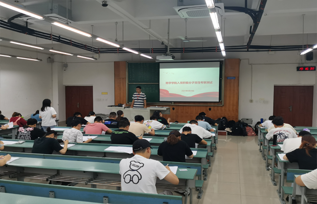 七点,监考员分发试卷,考场负责人站在讲台上看着整体考试情况,另外会有两名同学进行巡逻式监考,十分注重考场纪律,绝不放过一个违反考试规则的人,对作弊行为绝不姑息,测试中同学们埋头认真答题,都希望自己可以在测试中获得较好的成绩,早日成为发展对象而努力。有些同学对内容十分熟悉,自信满满提前离开交卷,有些同学稳扎稳打,慢慢琢磨题目,不放过任何一个得分点。