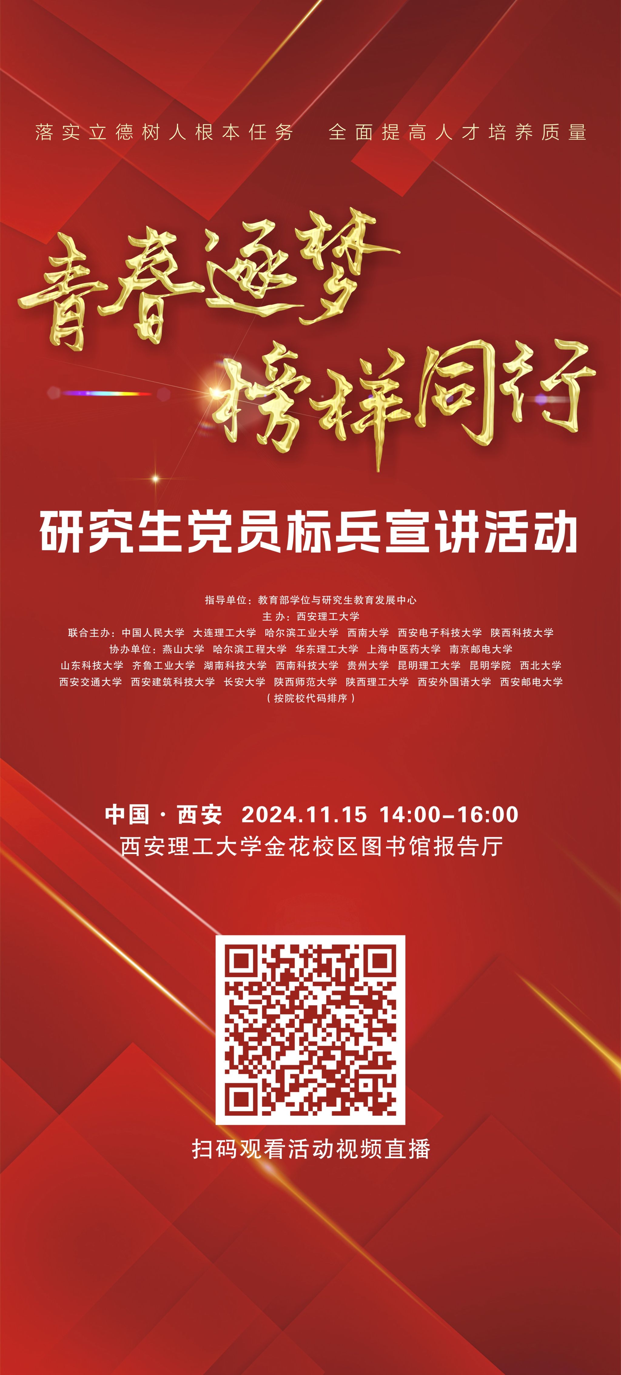 为深入学习宣传贯彻习近平新时代中国特色社会主义思想,进一步落实立德树人根本任务,全面提高人才培养质量。由教育部学位与研究生教育发展中心指导,西安理工大学联合6所高校主办,19所高校协办的“青春逐梦 榜样同行”研究生党员标兵宣讲活动,邀请了7名第三批全国百名研究生党员标兵进行宣讲,展示标兵风采。