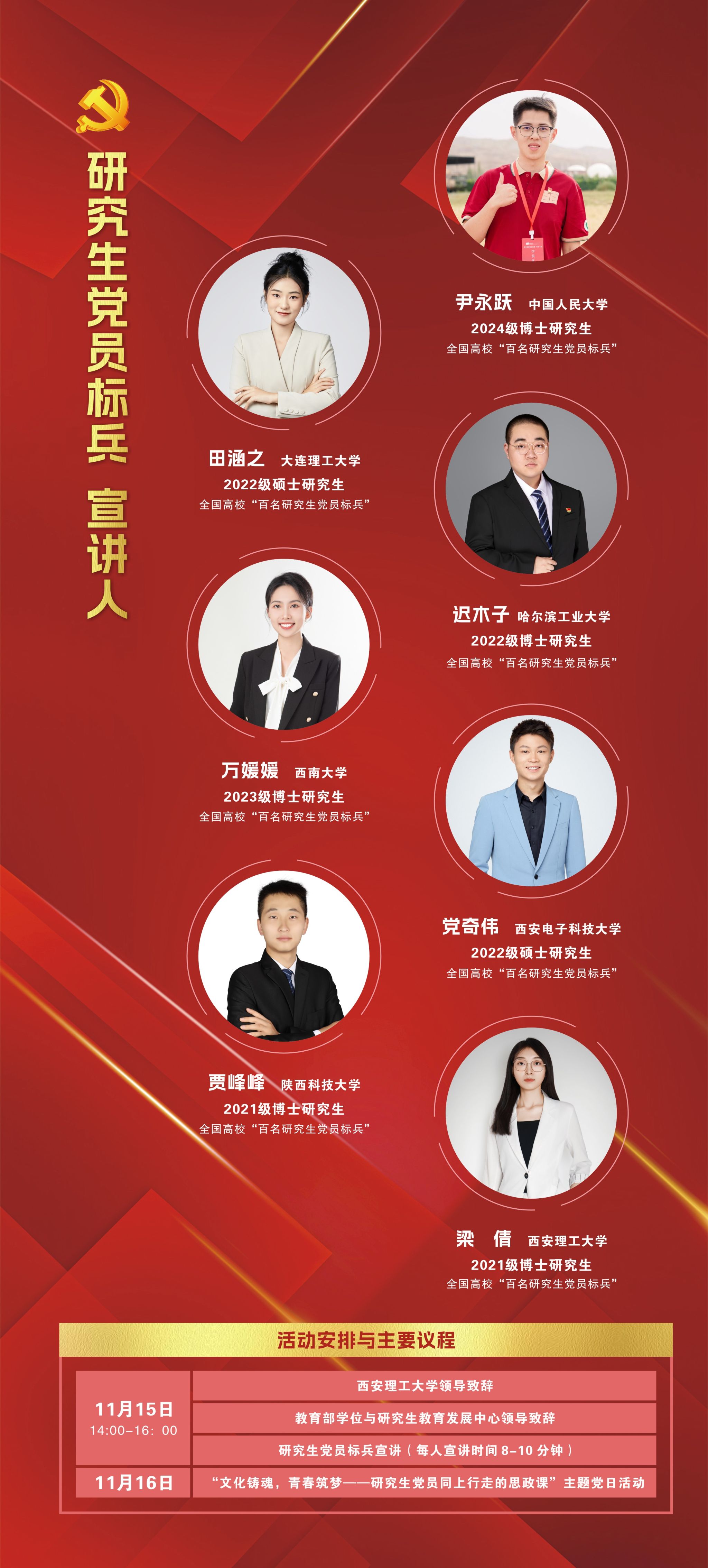 2.各党支部应高度重视此次 “青春逐梦 榜样同行”研究生党员标兵宣讲活动,引领支部成员积极创先争优,发挥先锋模范作用。
