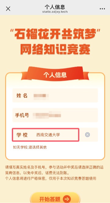 第三步:填写所在学校名称(西南交通大学)、个人姓名、手机号码(个人信息将进行严格保密,仅用于本次知识竞赛答题使用)