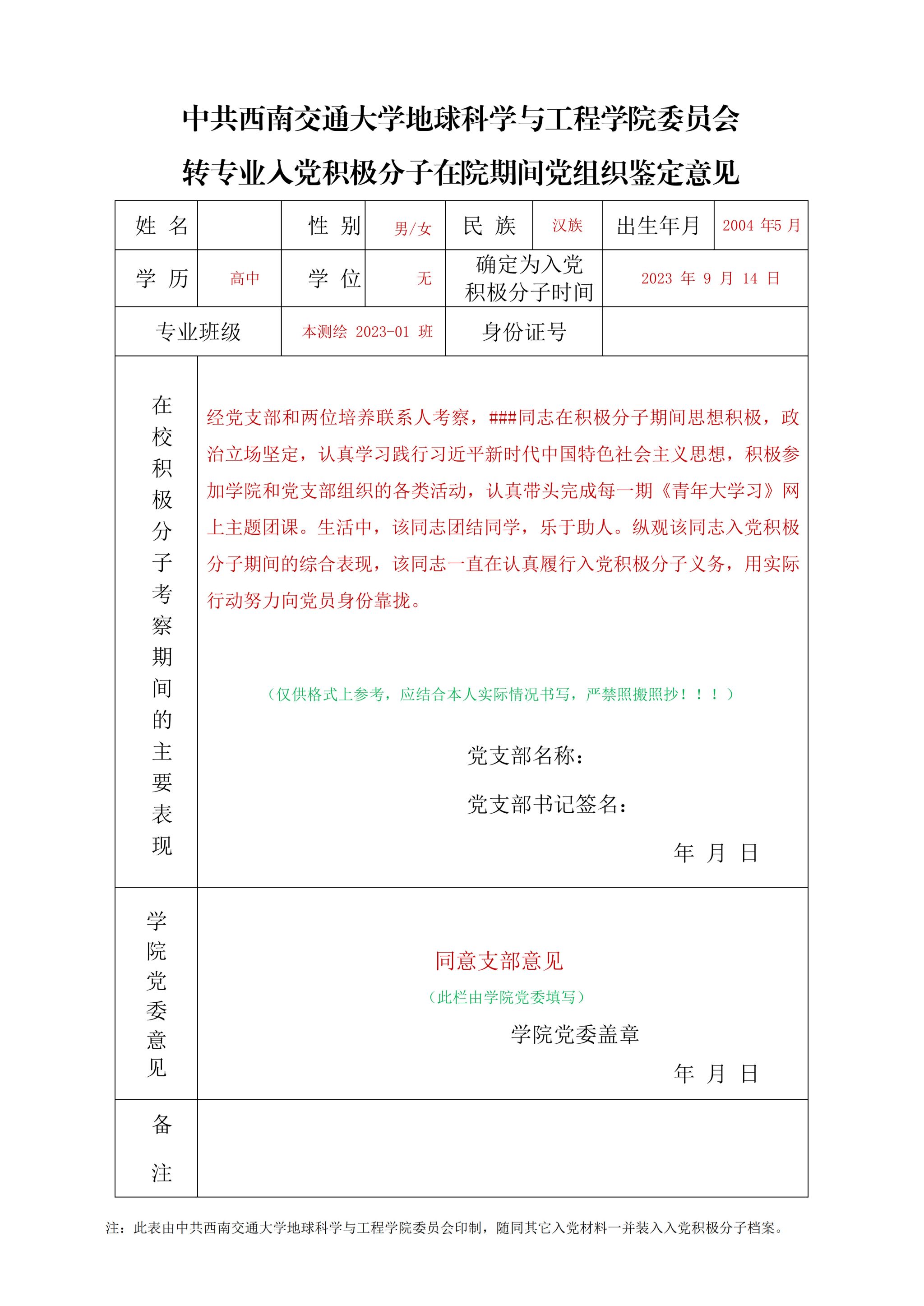 (2)转专业入党积极分子在院期间党组织鉴定意见样例与撰写指南: