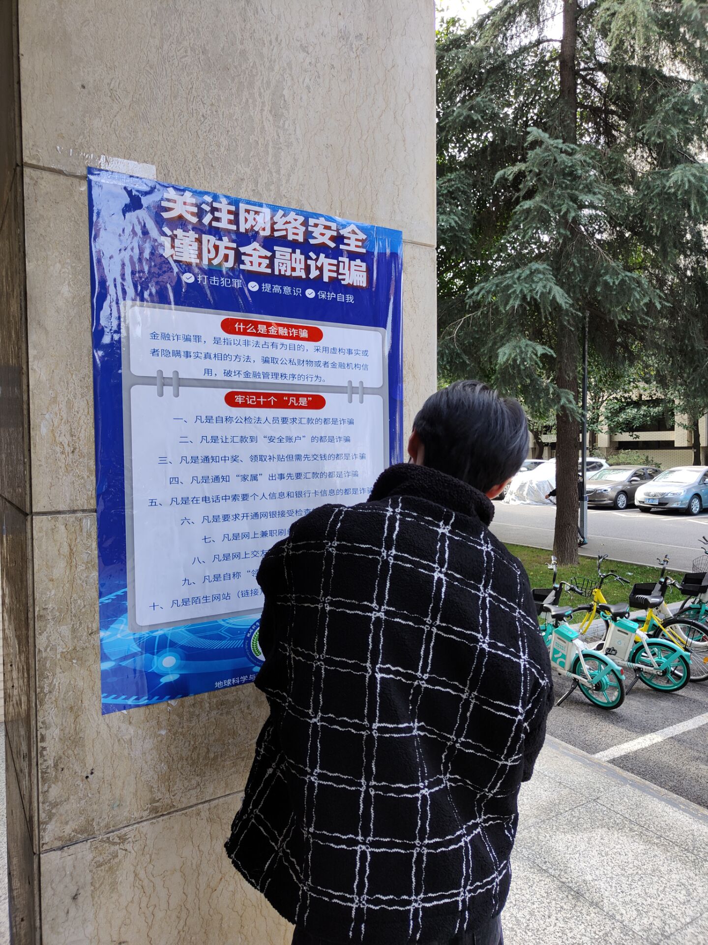 研究生会还委派了研会成员在九里校区第四教学楼与食堂附近张贴网络安全防诈骗海报,旨在加强同学们的网络安全意识,防止上当受骗。
