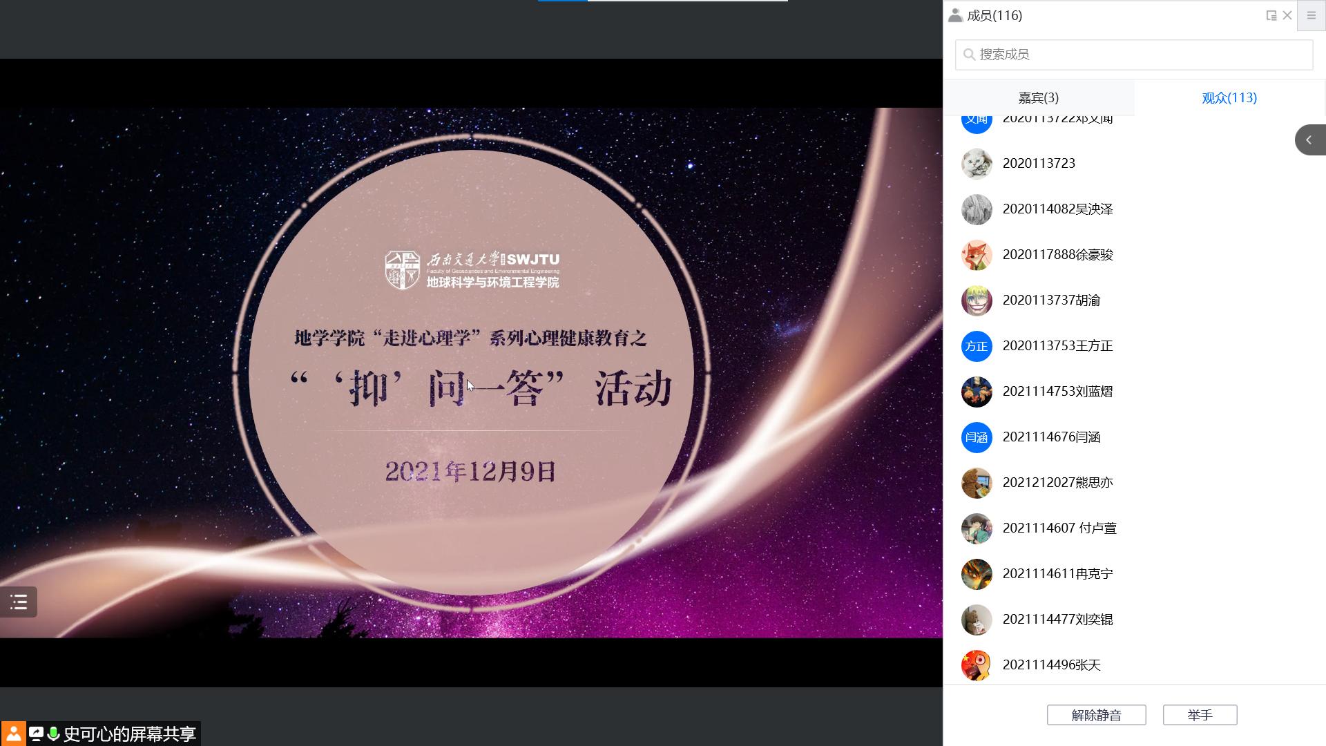 于12月9日下午16:00,采用线上腾讯会议的形式,组织开展了“走进心理学”系列心理健康教育之“‘抑’问一答”活动。本次活动由心理研究与咨询中心的杨兴鹏老师主讲。