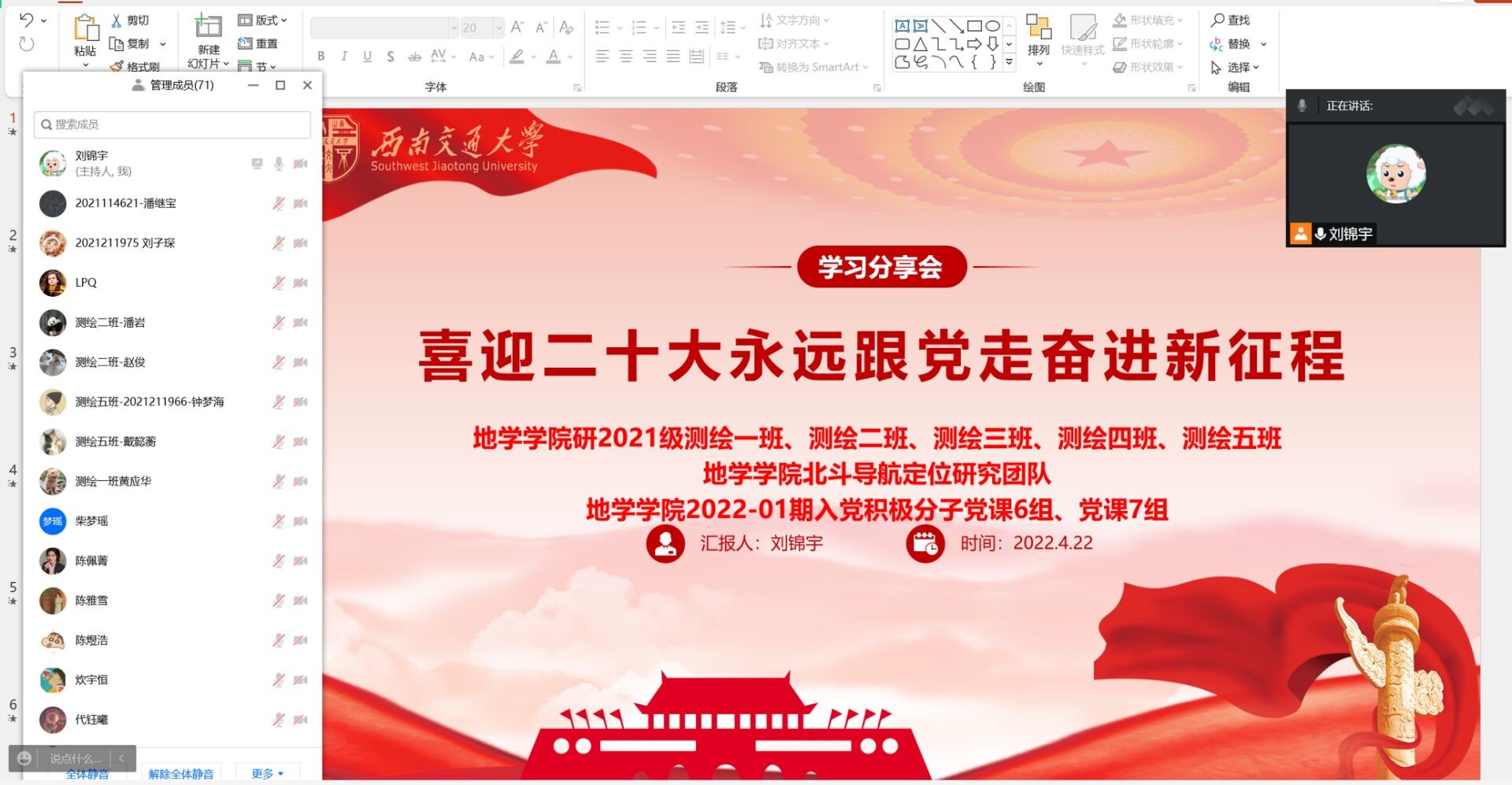 为深入学习贯彻习近平新时代中国特色社会主义思想,引领全院师生党员深刻领悟“两个确立”的决定性意义,增强“四个意识”,坚定“四个自信”,做到“两个维护”,弘扬伟大建党精神,以优异成绩迎接党的二十大胜利召开,2022年4月22日北斗导航定位研究团队邀请研21级测绘一班、测绘二班、测绘三班、测绘四班和测绘五班举办地学本硕学习分享会。今年也是中国共青团成立100周年,团结引领广大青年坚定跟党走、建功新时代是对共青团成立100周年的最好庆祝。