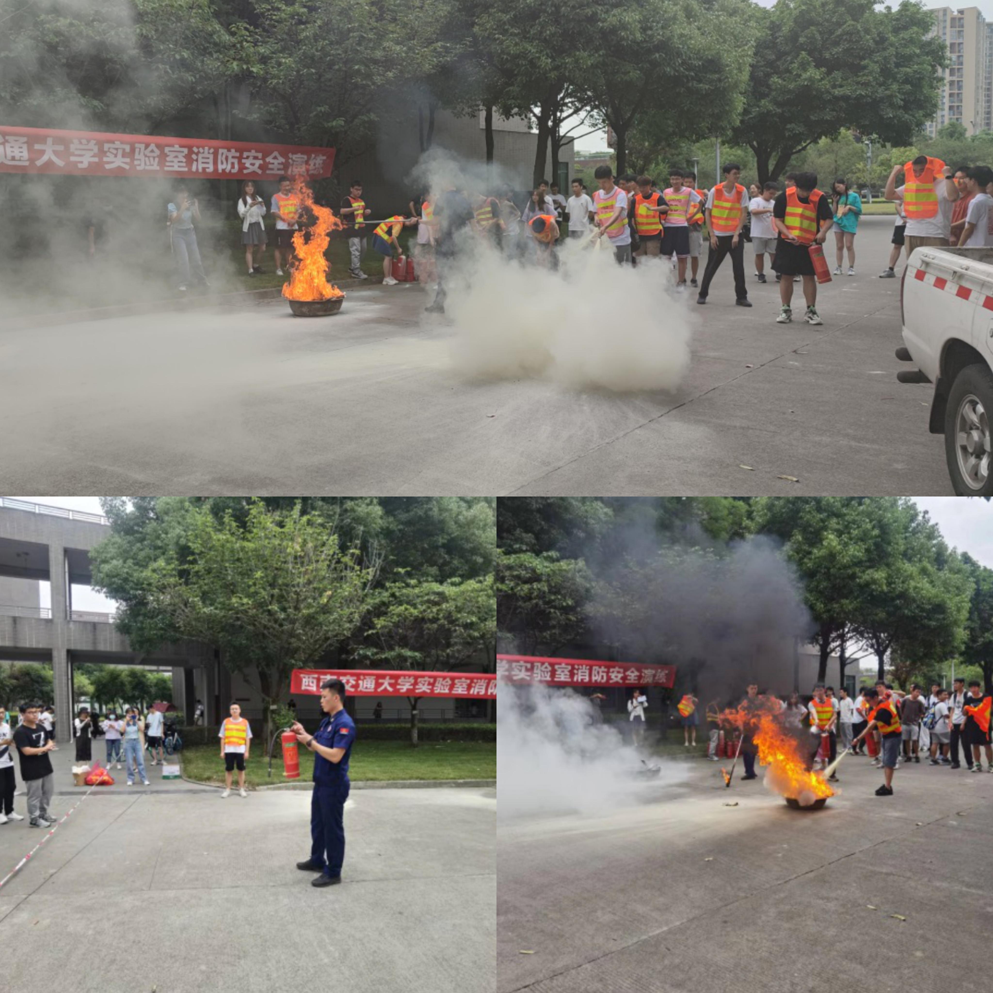 活动第二阶段是灭火演练和“消防车趣味灭火小游戏”,参训师生来到犀浦四号教学楼东侧空地,由郫都区消防应急救援中队李指导及消防战士现场指导师生开展应急演练实践,实地培训灭火器的使用方法与细节,同学们分为四组轮流进行灭火器操作实践。