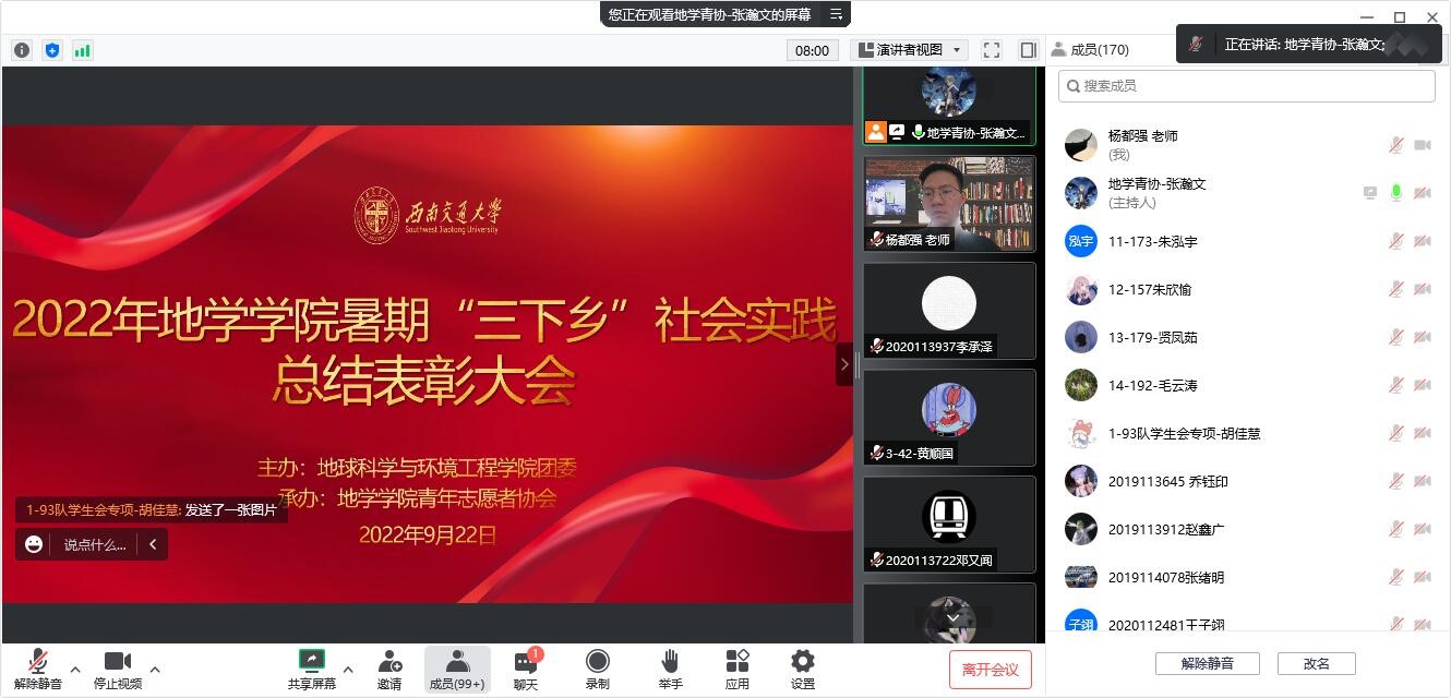 暑期“三下乡”社会总结表彰大会顺利举行!疫情期间,答辩代表们通过线上会议的形式,仍认真地完成了答辩展示任务并将习近平总书记在庆祝中国共青团成立100周年大会的重要讲话精神落实到实处,以实际行动迎接党的二十大胜利召开!