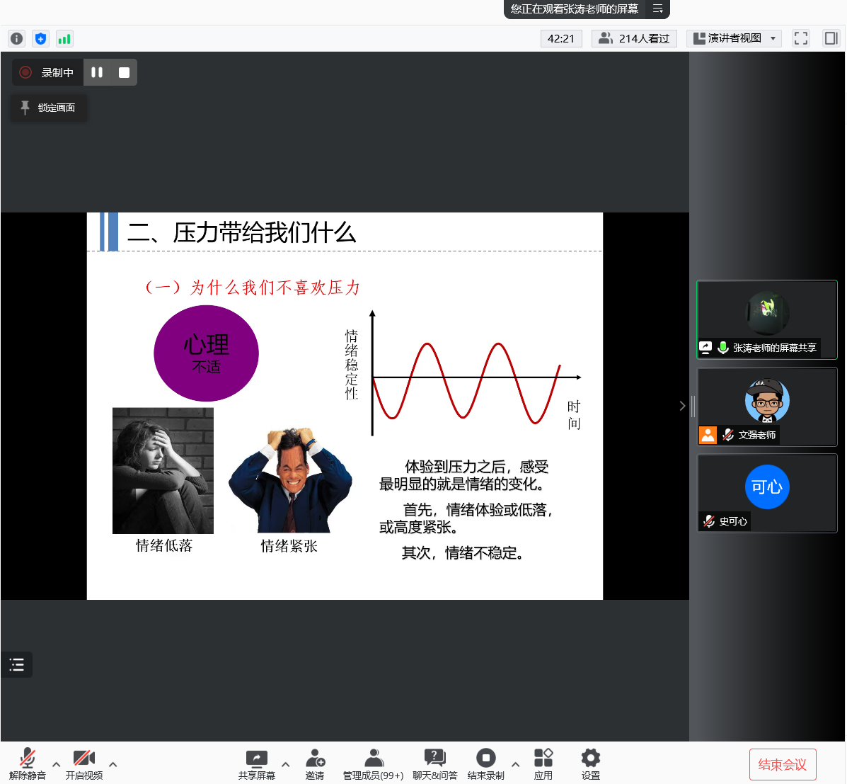 通过腾讯会议举办了以“心起点·心能量—应对压力,快乐前行”为主题的心理健康教育讲座。此次讲座由心理研究与咨询中心的张涛老师主讲,2021级研究生辅导员文强老师主持,分管学院心理工作的史可心老师和2022级全体研究生新生参加。