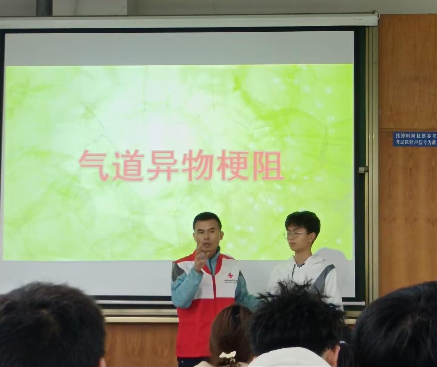 下午13点至17点,红十字会老师讲解应对气道异物梗阻的处理办法。通过列举几个生活中实际发生的案例,向同学们展示了气道异物梗阻的危险性,以及在这种情况下如何进行应急处理。接下来,红会老师讲述了生活中引起心搏骤停的因素、临场心搏骤停的判别方法、以及心肺复苏的正确操作流程。在理论讲解之后,红会老师借助教具模型为同学们演示了如何正确进行心肺复苏。通过结合理论与实践的学习,同学们渐入佳境,积极与老师配合协助完成示例,并练习心肺复苏操作。