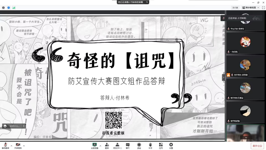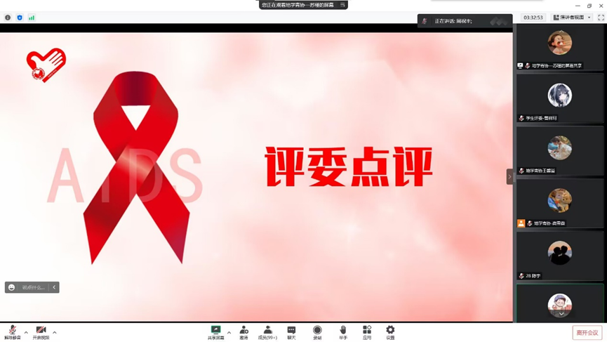 当日19:00,于腾讯会议线上举办了防艾作品宣传大赛的答辩。校学工处党委学生工作部刘颖老师,校团委罗洪老师,地球科学与环境工程学院杨都强老师、郑非老师,校红十字会周祝丰老师,医幼场馆中心校医院李林燕老师出席本次活动。地学青协王馨溢主持本次活动。本次活动一共有136个小组报名共计175人,收到提交作品130个,有103个合格作品共计参与人数136人,最后筛选出28个优秀作品进入决赛,地学青协qq宣传阅读量1124。