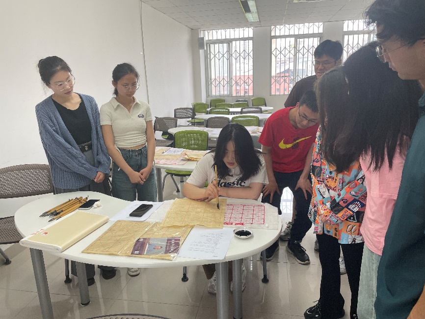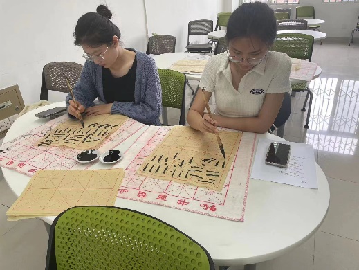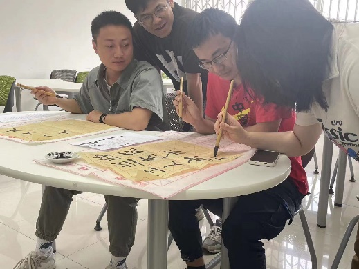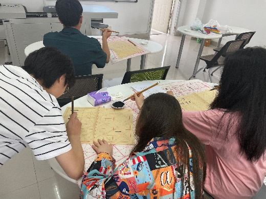其次,大学生书画协会九里分会的同学对书画协会进行了简单的介绍,并带领大家一起学习毛笔字书法的相关知识,包括握笔姿势、笔划书写方式等。在同学们正式开始写作前,书画协会的同学线给大家进行现场教学,演示了如何正确握笔,并示范如何用毛笔写出规整的笔划。