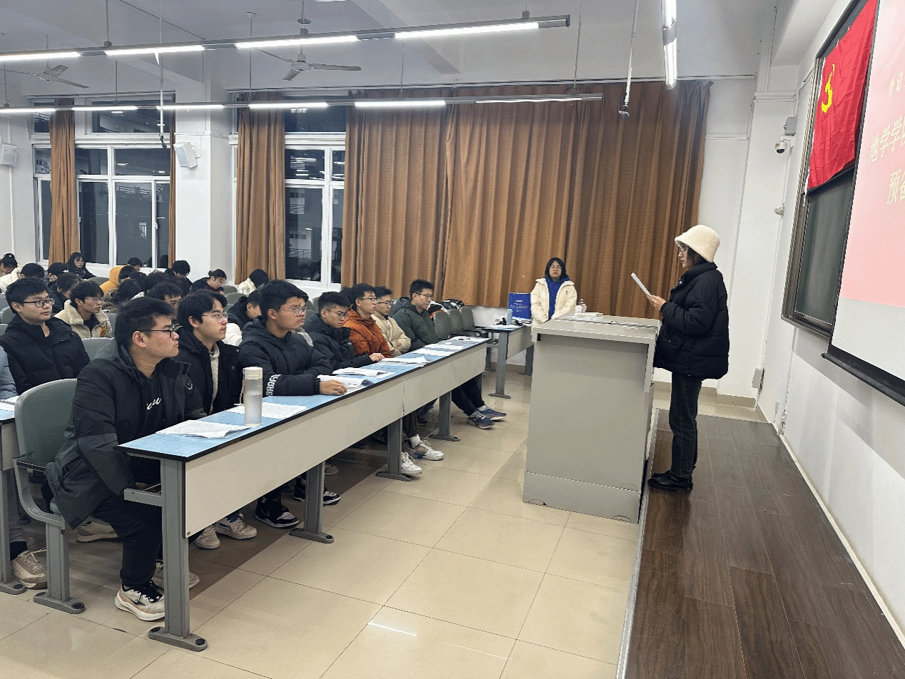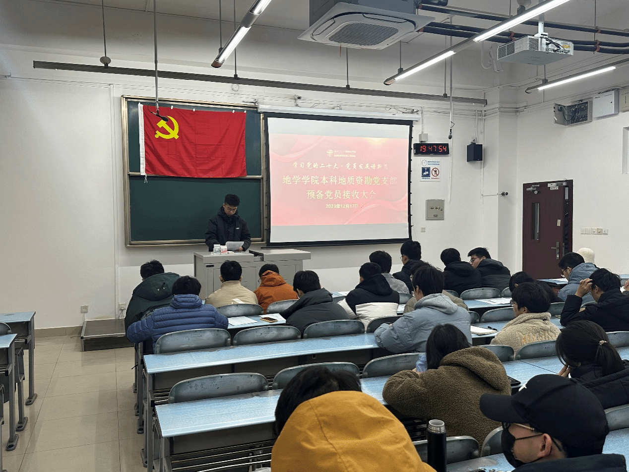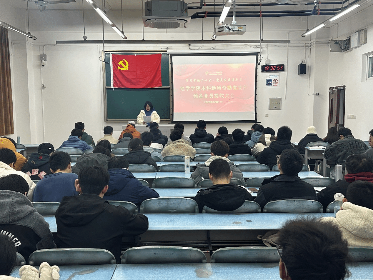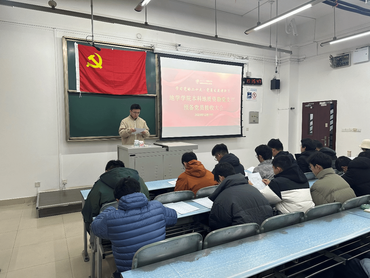 本科地质资勘党支部在X2220教室顺利召开预备党员接收大会,本次大会的议题:讨论是否同意接收刘宗旭、杨晨、林星杰、乔彦博、赵高伟、李骁群、王国英、廖望和朱梓宁9名同志为预备党员。会议由党支部书记薛怡然同志主持,支部正式党员应到会10人,实到会8人。