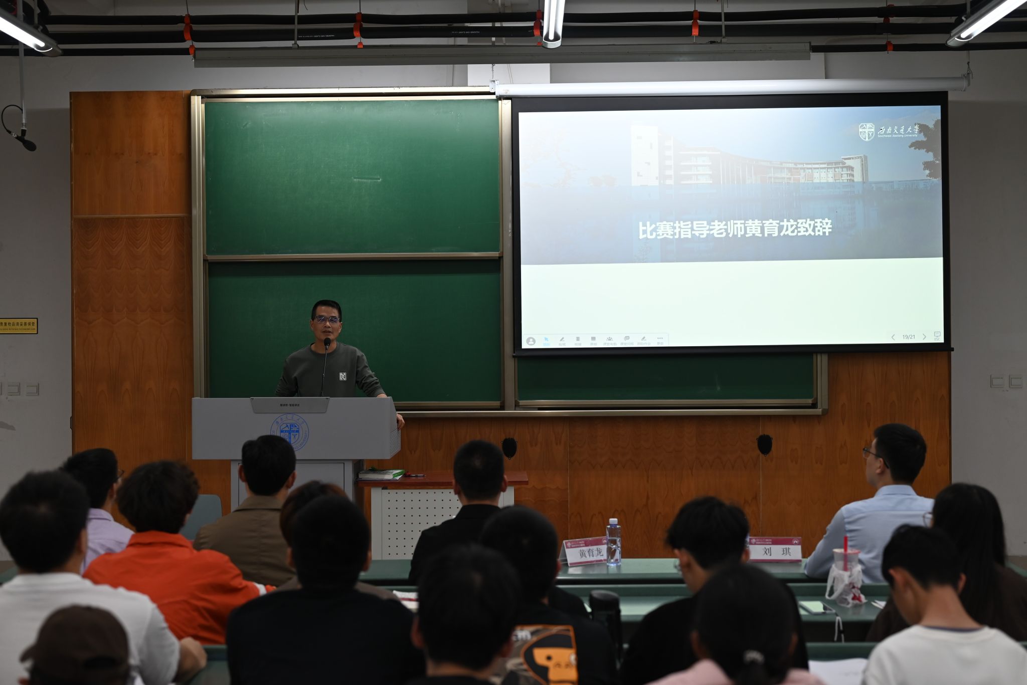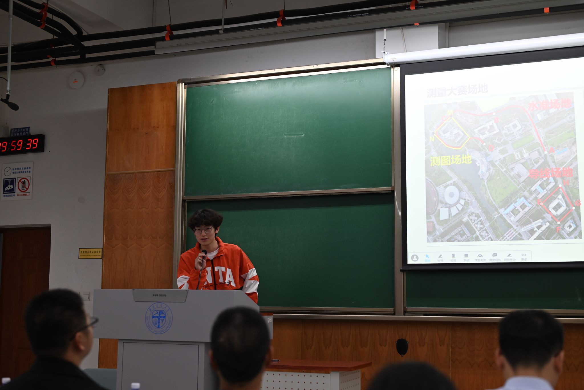 紧接着是由西南交通大学测量协会会长任占昊说明了此次大赛的报名情况,然后为选手们详细介绍了比赛场地、比赛规则及大赛注意事项,并表示测量协会将全力为比赛顺利开展保驾护航。