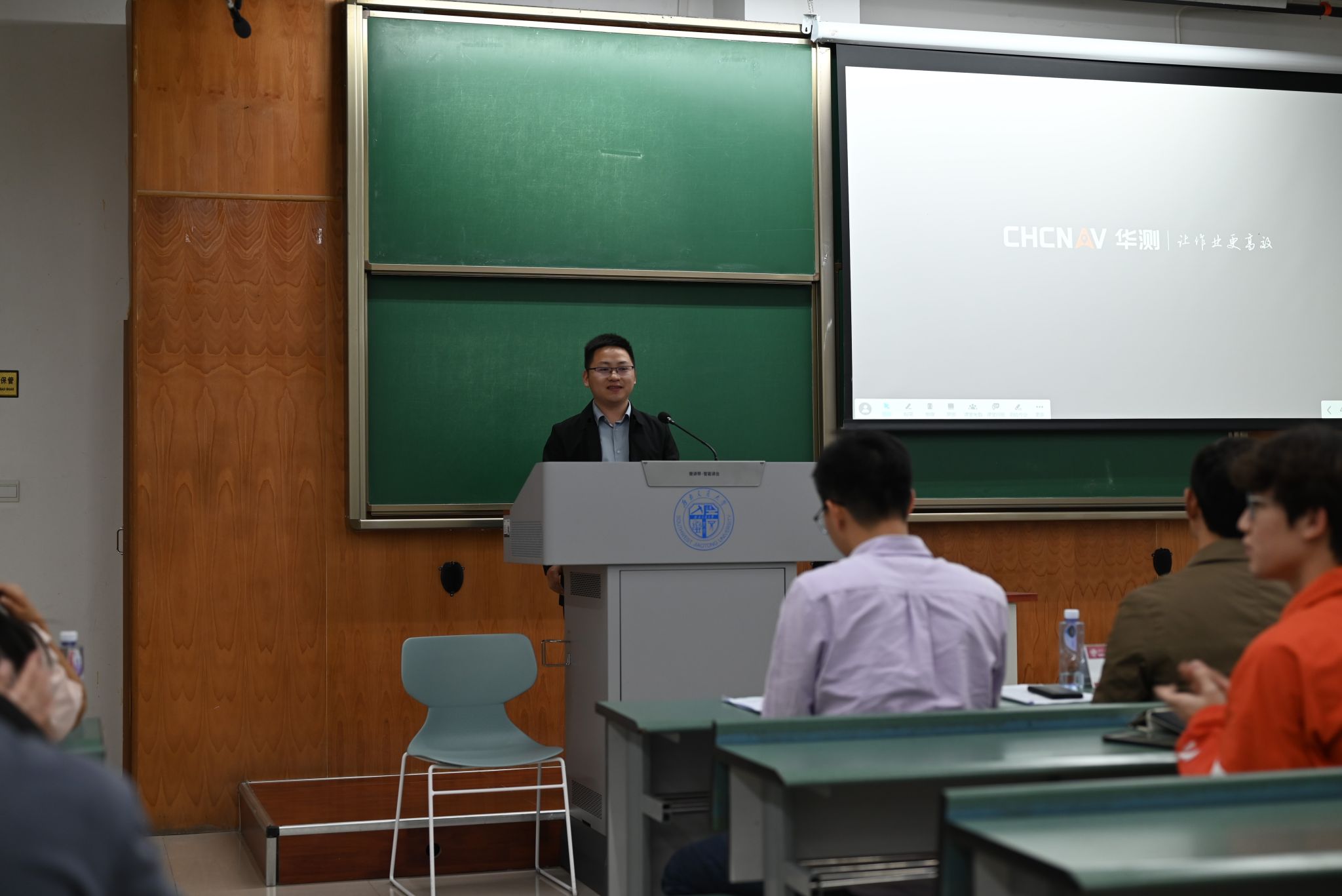 活动第二项,由上海华测导航四川公司副总经理廖猛先生为同学们致辞。廖猛经理向同学们介绍了上海华测导航公司的概况及理念,也展示了先进的测绘相关技术设备,同时向大家播放了上海华测导航公司展示视频,并预祝各位参赛选手能够于本次大赛中取得佳绩。