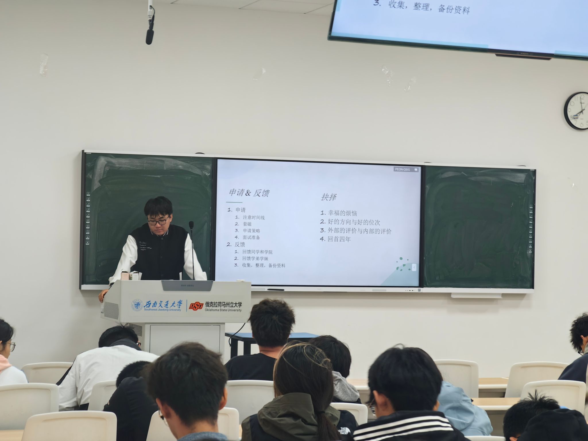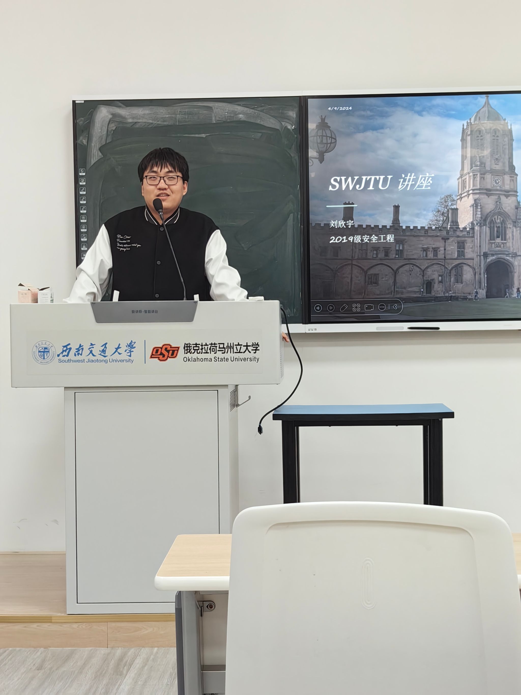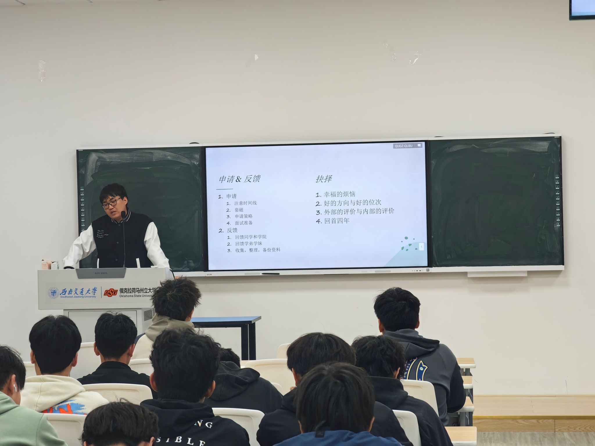 SWJTU-OSU合作办学项目部于2024年4月9日晚开展职业生涯规划讲座,本次讲座由2019级安全工程专业刘欣宇同学主讲,现就读于英国牛津大学工程科学系。本次讲座聚焦大学学习历程、目标设定与行动,以及分享申请海外学校的相关注意事项,2023安全工程(中外合作)与环境工程(中外合作)全体同学参加。