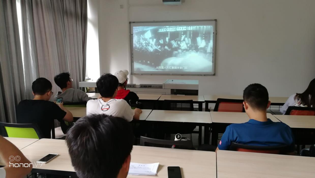 首先,团支书上台开始介绍本次团日活动主要内容和中心思想,今年是五四运动100周年,团支书强调了我们要发扬五四运动精神,和明确新时代中国青年坚定不移跟党奋斗的责任与担当。随后,团支书组织同学们观看五四运动100周年特别纪录片《五四记忆》。在观看完影片后,宣传委员和组织委员共同组织大家唱起了歌曲《我和我的祖国》。“我和我的祖国一刻也不能分割,无论我走到哪里都留下一首赞歌”,优美的歌词、轻快的旋律,我们的心中满是对祖国的爱和敬意。在观看完影片和唱完歌曲之后,班委组织大家互相交流自己对本次活动主题“青春心向党,建功新时代”的一些想法和体会。在交流过久,同学们踊跃地发表了自己的一些感想。在活动的结尾,团支书对本次团日活动做了总结,全体同学合影留念,本次团日活动圆满结束。