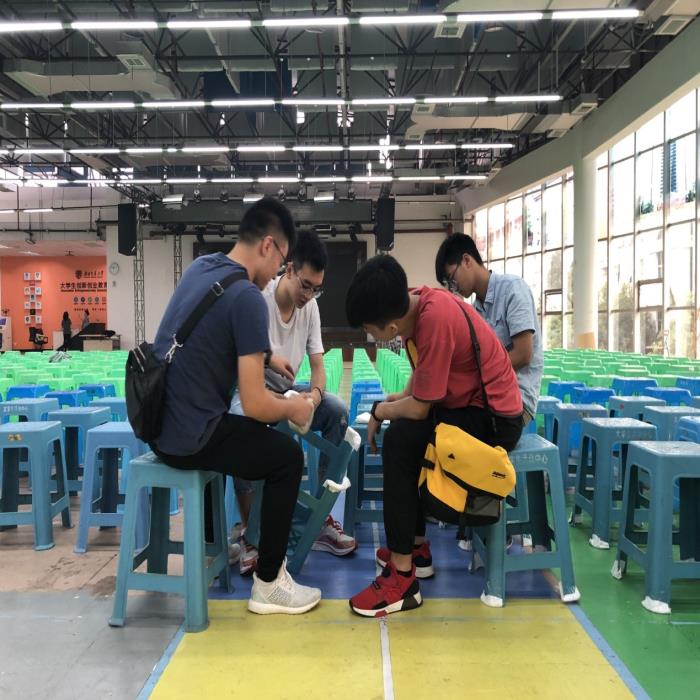 令人赞许的是,新生们为防止板凳腿划伤地板而为每一个板凳腿裹上了脚套。一丝不苟、团结合作,既拉近了彼此之间的距离,收获了友谊与归属感,也为办好开学典礼做出了属于自己的那份贡献,向学院交上了一份优异的答卷。