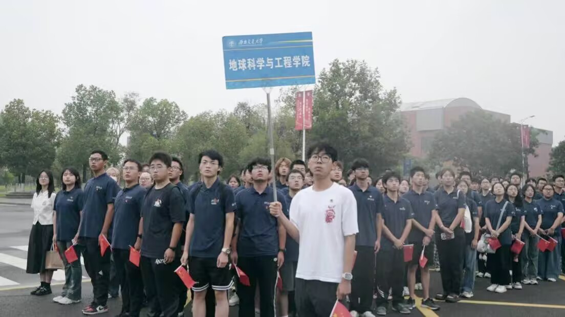 2024级新生同学们身着统一制服,英姿飒爽,迈着整齐划一的步伐,护送国旗入场。