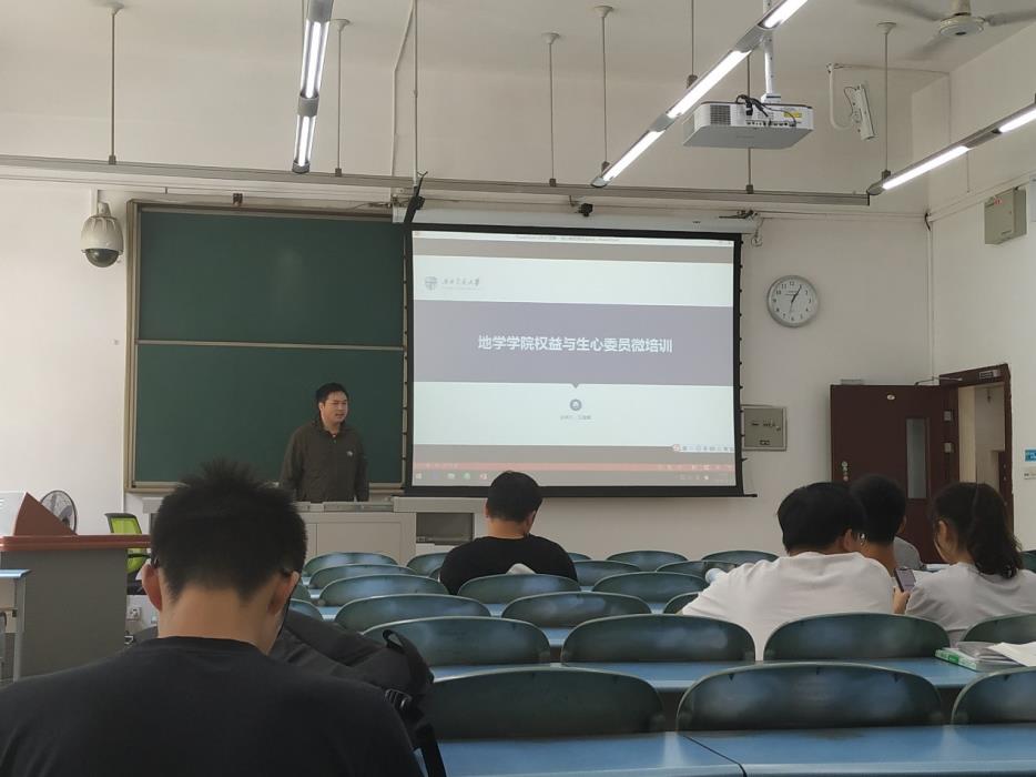 权益与生心委员第一次版团干部微培训,学生会生活部部长江金宸为学院17级、18级各班权益与生活委员进行了培训。江金宸部长从寝室安全、卫生知识普及以及文明寝室评选这三个角度来为大家进行培训。