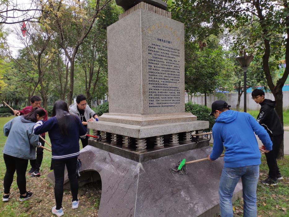 周日下午四点半,秋高气爽,阴凉的天气正适合我们开展打扫工作,小伙伴们早早在雕塑前碰面,相互交代了一下需要做的工作后大家便投入到了紧张的打扫工作中,参与打扫的志愿者们分工明确,积极主动,有的人扫去落叶,有的人抹去灰尘,有的人擦去污渍。清洗时使用的抹布与拖把是向二教的清洁阿姨借的,在借还的过程中,志愿者们都很细心地将拖把放在水桶中然后走动,一点都没有弄脏阿姨们的打扫区域,得到了清洁阿姨们的连连称赞。清洗完毕,雕像变得一尘不染,志愿者们也露出了开心的笑容。