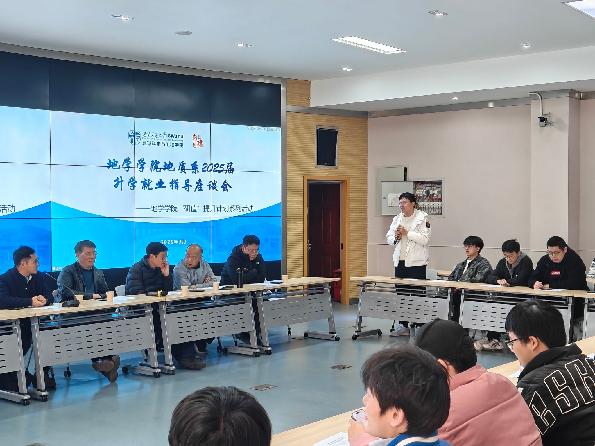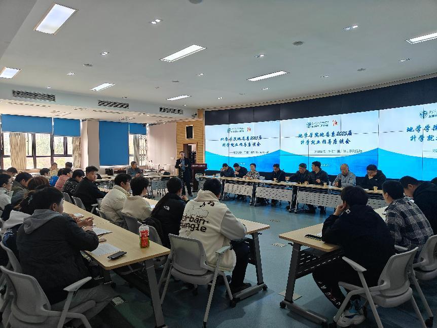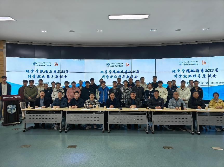 地质工程系教工党支部联合学院学习与科创中心在X4243组织开展2025届升学就业指导座谈会。此次座谈会是学院“研值”提升计划系列活动之一,聚焦升学与职业发展路径选择,通过师生深度对话为地质学生提供切实指导。本次活动由地质工程系教工党支部书记张志厚老师主持,地质系老师胡卸文、赵晓彦、陈强、赵志明、廖昕、裴秋明、石宇、许钟元,毕业班辅导员老师梁爽及2025届本科毕业班待就业学生参加本次座谈会。