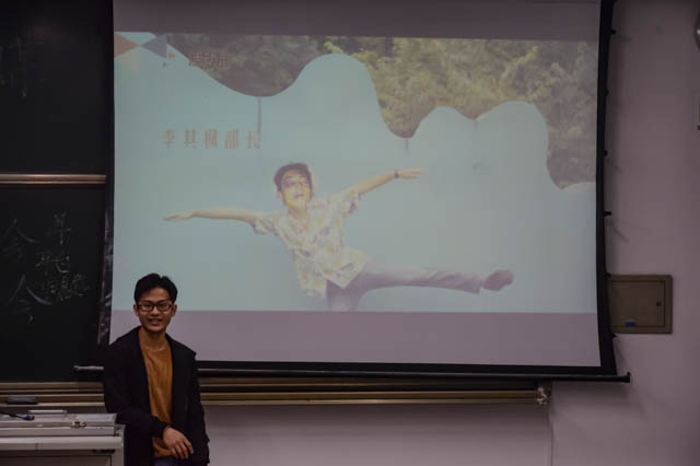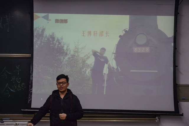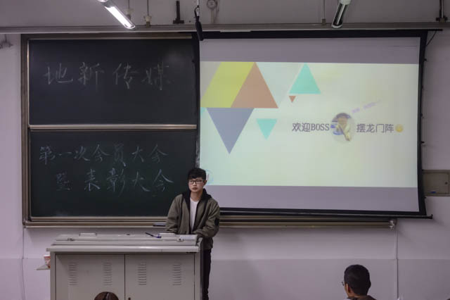在一段暖场视频过后,地新传媒的宋主席上台讲话。作为主席,他肯定了传媒的小伙伴们在过去的一个学期里付出的努力;作为部员们的学长,他分享了自己关于大学生活的一些心得和体会。