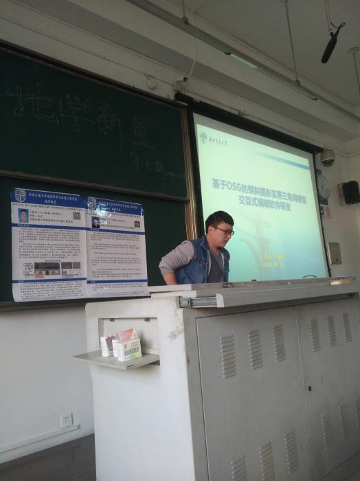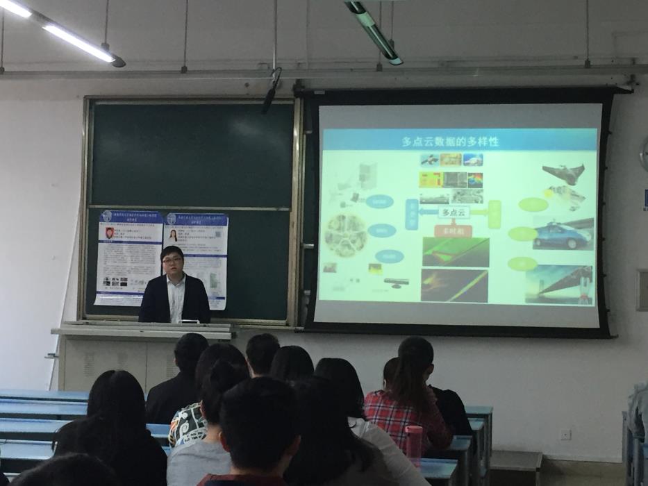 在X2422教室中,由2016级硕士研究生尚琪森和2017级硕士研究生侯晓彤进行汇报。尚琪森介绍了“基于多目标加权最短路径的倾斜摄影测量三维模型特征线提取方法”的相关内容,侯晓彤对“面向示意道路地图的时间可视化表达方法比较分析”进行了介绍。