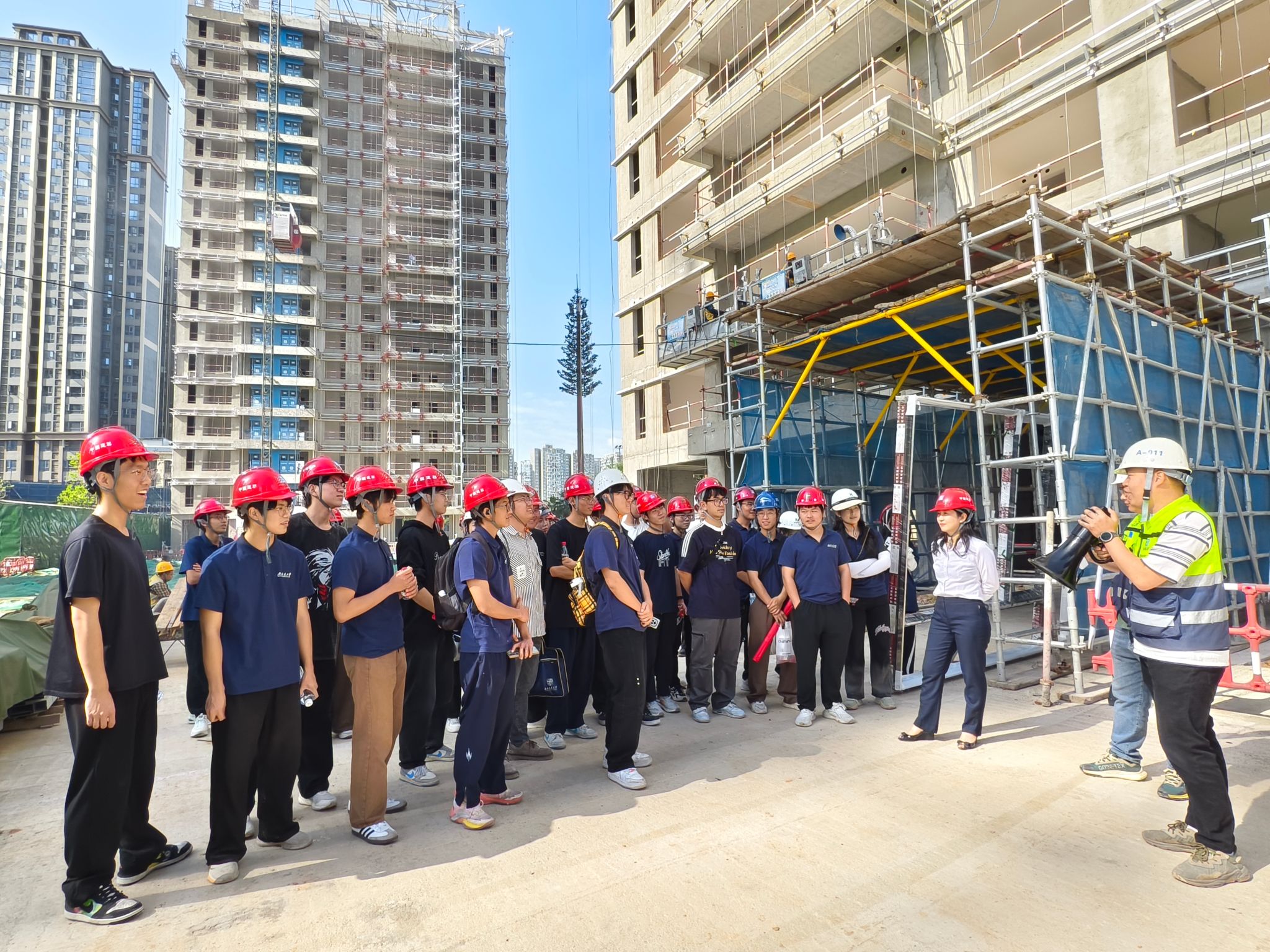 随后,支部成员实地走进四川师大静桉南TOD综合开发项目施工现场,工地项目负责人带领支部成员整体参观了整个工区,负责人为同学们详细介绍了工地的区域分布、建设进度、楼层的建设标准、抗震等级、施工工艺、安全注意事项等。参观过程中,同学们也就专业所涉及的各类就业问题、行业发展等与项目负责人进行了深入交流,展现出浓厚的职业探索热情。