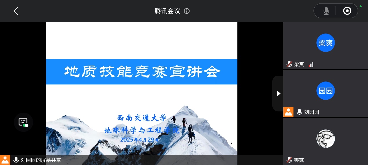 地质工程系刘园园老师于线上举行了第十四届“地学科技月”系列竞赛之2025年西南交通大学地质技能竞赛宣讲会,对于本次竞赛基本情况、比赛项目及规则做全方位介绍。本次宣讲会为同学们提供了详细的赛前指导,帮助学生消除参赛顾虑,同时为后续省赛、国赛进行宣传,使同学们明确参赛目标,为参与更高级别的专业赛事做准备。