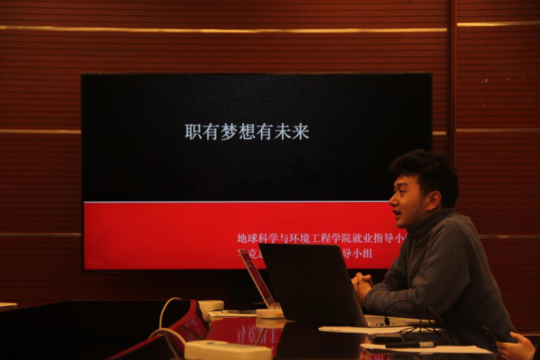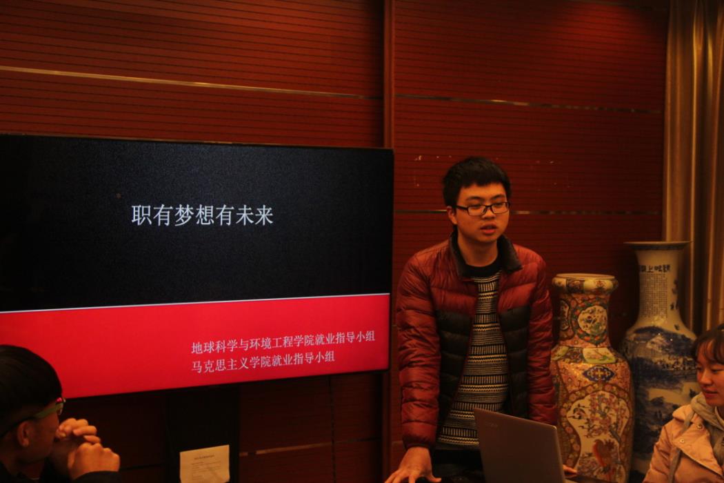 2017年1214日星期四,地球科学与环境工程学院与马克思学院在X4531共同举办了“职业有梦想有未来——大学生就业指导活动”座谈会,对活动前期收集征文进行了展示并组织同学积极探讨完成。