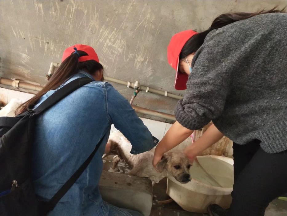 刚走近爱之家,就有一大群流浪狗围了过来,一些队员都有些惶恐,但通过一段时间的相处,志愿者们从开始的手足无措,到与狗狗们亲密相处,小狗们亲昵的依偎在志愿者身边。队员们在基地当了一天的义工,清理走道,打扫庭院,搬运沙土,给流浪猫狗洗澡。值得一提的是,活动当天适逢爱之家正在为狗狗们建狗舍,为了帮助阿姨们减轻负担,我们排成长队,传递沙桶、水泥桶。水泥很重,许多女同学的手都磨破了,但是依然坚持在传递沙桶,为流浪狗们奉献出自己的一份爱心。由于爱之家的狗大多处于群养状态,有很多小狗或多或少都患有一些皮肤病,在给流浪狗洗澡的时候,队员们都小心翼翼的不去触碰到狗狗的伤口,尽可能的在减少痛苦的情况下,为他们清洁身体,并且在当地义工的知道下,为他们修剪了毛发,擦拭伤口。