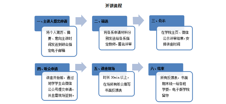 2.地学研究生会将根据报名人数以及主讲人申请的意向主讲时间,对出场顺序进行相应调整,并于开讲前2周进行通知。
