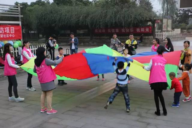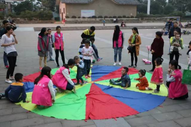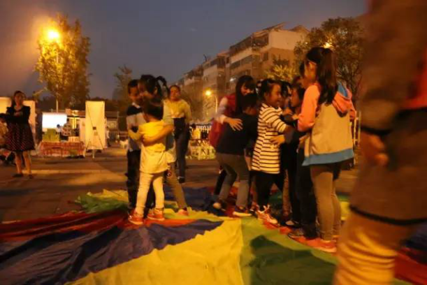 在顺江小区夜市的广场,我们开始动手布置现场,在准备阶段许多家长带着孩子走近了解我们的活动,当看到一张张稚嫩的脸庞在彩虹伞上蹦蹦跳跳,我们的心也跟着雀跃起来。