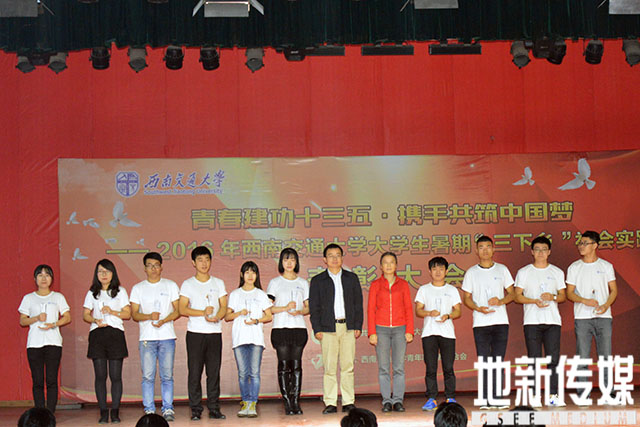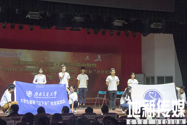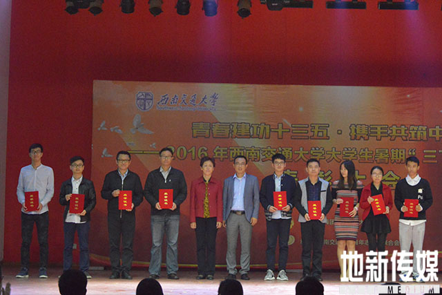 表彰大会正式开始,首先校园大使团带来《与你相关,我就爱恋》诗朗诵,伴着同学们如春风般的朗诵,仿佛看到了志愿之路的大旗迎风招展。紧接着朱剑松宣读《西南交通大学2016年大学生暑期“三下乡”社会实践活动表彰决定》,并向获奖者及获奖团队表示祝贺,现场响起了热烈的掌声。接下来,进行了话剧,舞蹈以及文化展示的表演,并分别为社会实践优秀个人人代表,社会实践优秀团队代表,社会实践优秀指导教师代表颁奖。