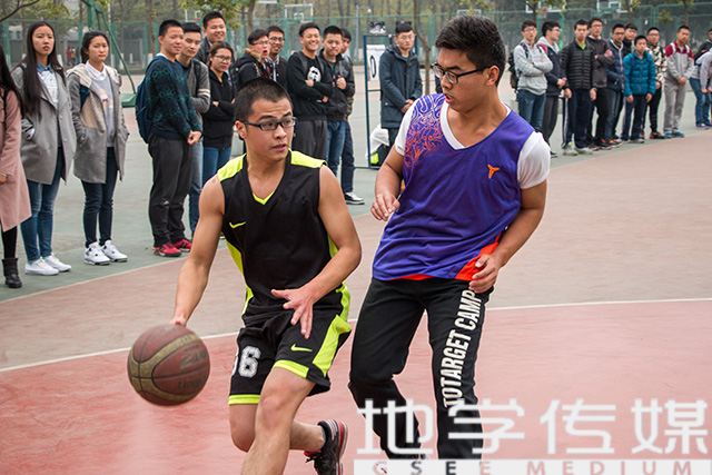 第二场比赛则是大一学生与大二学长之间的较量,15级出场的是环境五班与地质二班的队员,14级出场的是地质三班与环境三班的队员。开场后14级队员进攻态势凶猛,比分打到了8比3。可是随着15级队员的一记自信三分球的得分,鼓舞了士气使比分慢慢追了上来。半场结束时,14级10比8小比分领先。下半场两队打得不分上下,十分胶着。但14级队员紧追不放,将篮板牢牢控住,各自发挥出自己最佳的实力,最后14级以16比14险胜15级队员。
