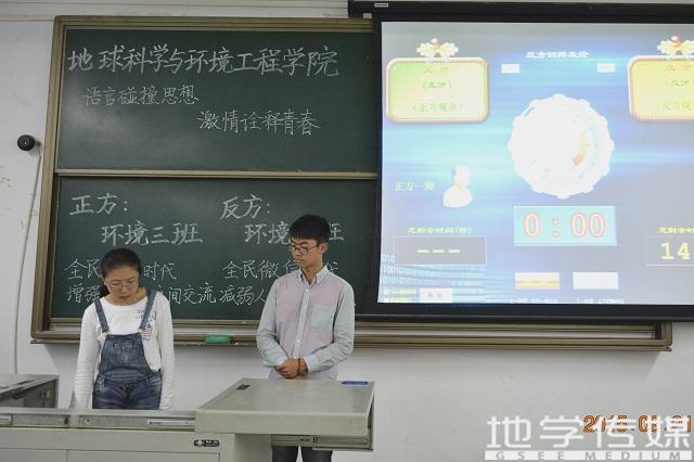 2015年9月21日晚,地球科学与环境工程学院新生杯辩论赛在X7401正式拉开序幕。地质一班与环境五班的辩手们以“全民微信时代增强还是减弱了人与人之间的交流”为辩题进行了辩论。正方:地质一班,坚持的观点为“全民微信时代增强了人与人之间的交流”;反方:环境五班,坚持的观点为“全民微信时代减弱了人与人之间的交流”。