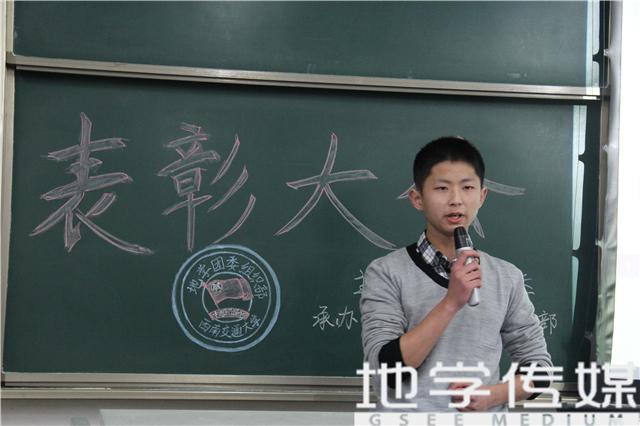 表彰评比大会以地球科学与环境工程学院辅导员杨都强致开奖辞而拉开帷幕。杨老师对此次团队活动做出了高度评价,他指出,在这次活动中,各支部不仅在校园各个不同的地方精心开展,更把活动的舞台扩展到校外,每个参与者不仅乐在其中,还提升了自我能力,活动的巨大成功,加深了同学们对社会主义核心价值观的认识,他还代表团委组织对参加此次活动的人员和团体表示感谢。