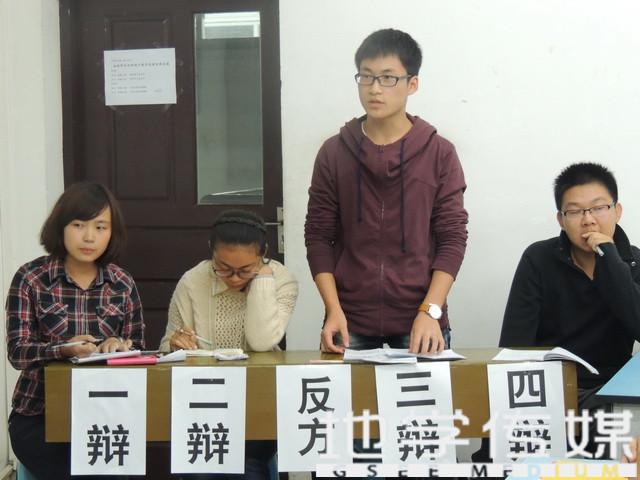 经过正反双方简洁的介绍,比赛进入开篇立论环节。正方一辩地质一班的武俊峰给出好马与回头草的定义,以社会条件和个人实际两方面为切入点,陈述己方“好马要吃回头草”的观点。反方一辩测绘一班的李恒松则以回头草是倒退之路,从吃与不吃回头草,何者更有利于好马的发展的角度,通过巴黎公社,改革开放的事例论述了“好马不吃回头草”的观点。