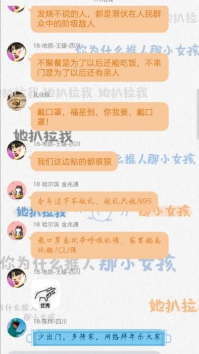2020年3月16日周一下午第一讲,地质一班全体成员在QQ群里举行了本学期第一次“以青年之躯,担防疫之责”主题团日活动,首先大家先观看了一个与防疫相关的视频,看完视频大家感触颇深,然后依次分享了疫情期间所了解到的抗疫英雄们相关的事迹。