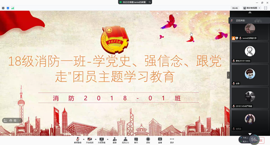 为了让广大团员青年积极参与党史大学习暨“青春的我,信仰的光”党史、新中国史、改革开放史、社会主义发展史的活动,2021年4月28日18:00,在18级消防第一团支部书记苏龙加甫·娜娜的组织下,18级消防第一团支部全体成员在线上召开了腾讯会议:18级消防一班-“学党史、强信念、跟党走”团员主题学习教育。