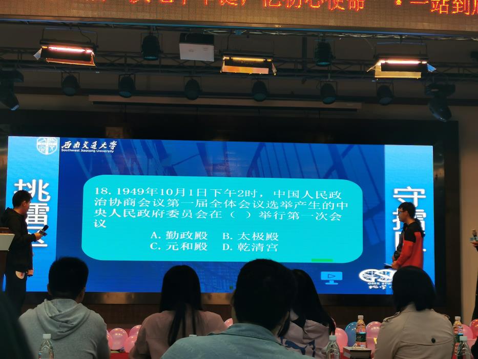 本次知识竞赛为同学们提供了展示风采的舞台,同学们在能力、知识与心理素质的综合较量中体现自身价值。第六届新生文化节“庆七十华诞,记初心使命”一站到底知识竞赛决赛在欢声笑语中落下帷幕。
