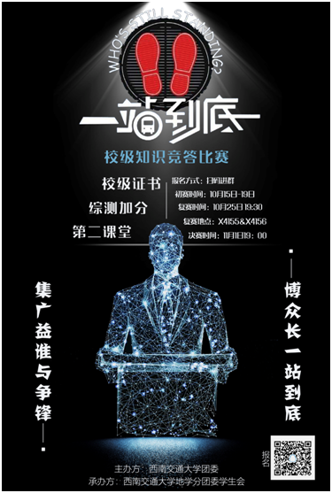 西南交通大学校团委主办,西南交通大学地球科学与环境工程学院学生会承办的第五届一站到底”—知识赛于1015日正式开始。此次比赛面向全体本科生,旨在丰富同学们的校园生活,激励同学们学习知识提升自己,提高大学生的综合素质和核心竞争力。