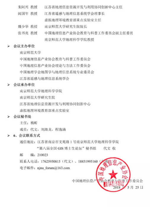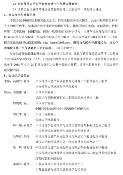 由中国地理信息产业协会教育与科普工作委员会、中国地理信息产业协会理论与方法工作委员会、中国地理学会地图学与地理信息系统专业委员会、江苏省遥感与地理信息系统学会联合主办的“第八届地理信息系统全国博士生学术论坛”拟于10月26-29日在南京师范大学召开,仍然采用免注册费、免食宿、赠专业书籍等活动。麻烦各位老师将该通知转发给贵校的有关导师及博士生,并鼓励大家积极参会。谢谢!