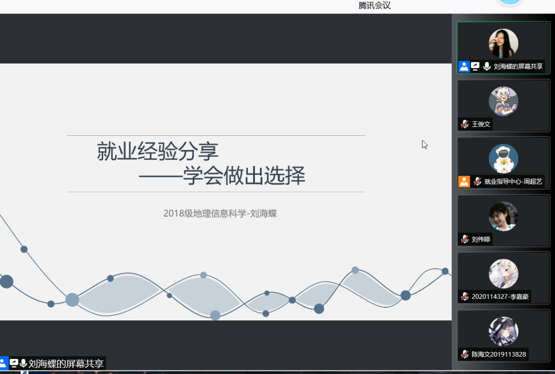 最后是线上答疑的环节,同学们在听完刘海蝶学姐的分享后都进行了积极的提问,学姐也是根据自己的经验耐心地答疑解惑,参加这次活动的除了即将面临就业的大三、大四的同学,还有许多大一新生,充分说明了大家对就业问题的重视。