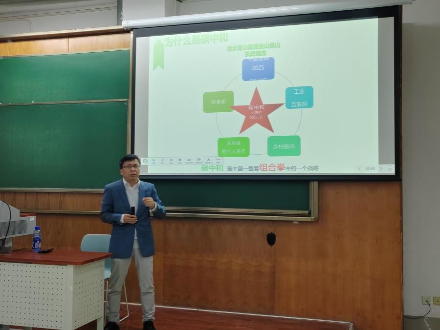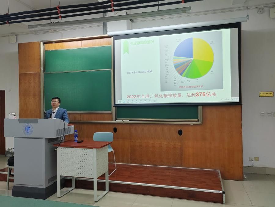 其次,李会生老师又为大家介绍了中国碳中和全产业链,带领同学们直观地认识到了世界的碳排放现状和中国实现碳达峰和碳中和的决心。并且,李会生老师还介绍了中国为实现碳达峰碳中和目标而制定的措施,以江苏省为实现碳中和而制定的计划为例,直观地展示中国在“双碳”问题上的决心。