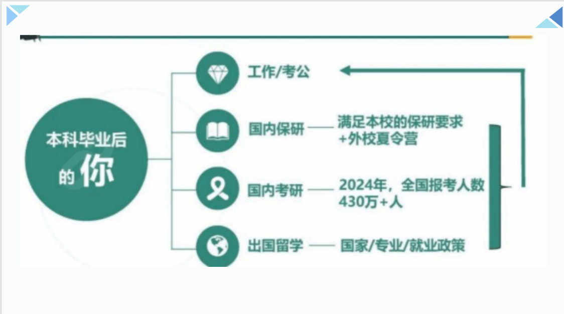 会议伊始,李娜老师以“本科毕业后的你”入题,阐述了当前大学毕业后,我们面临的就业市场竞争激烈程度以及所面对的不同选择——就业(考公),考(保)研以及出国留学,对于当前在不同国家留学的优劣情况进行了分析,便于同学们明确方向。